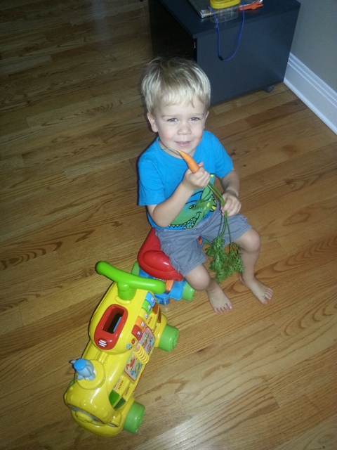 Among all of the gazillions of green tomatoes, Caden spotted an orange one.